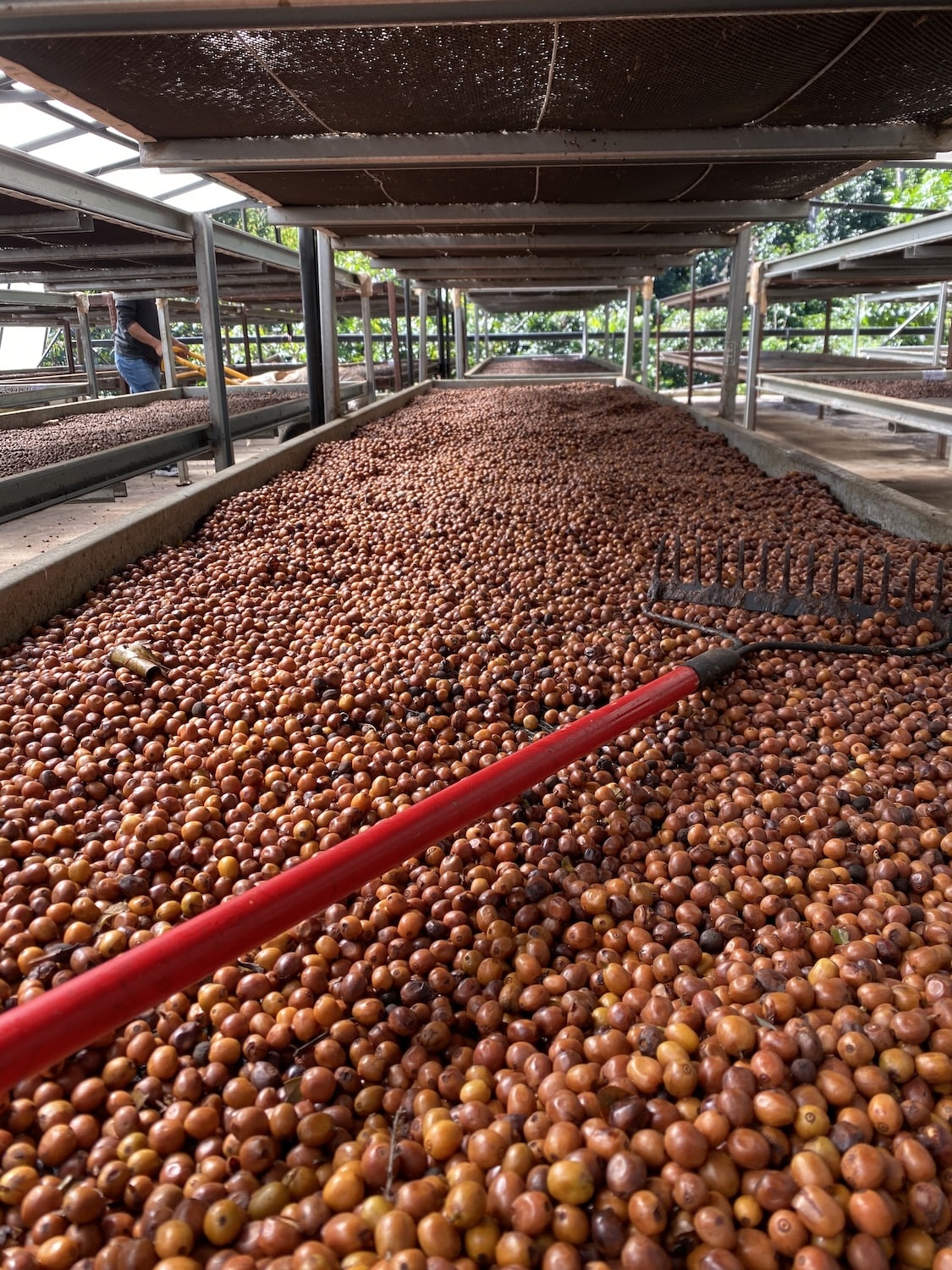 Das A steht für den anaerobe ‚Ausbau‘ oder Fermentation, in diesem Fall erlauben wir dem CO2 welches von den Kirschen ausgestoßen wird zu entweichen, lassen aber keinerlei Sauerstoff in den Tank. Der gesamte Prozess der Fermentation dauert 6 Tage. In den konzentrierten Säften die sich in den Tanks bilden, vereinen sich die Charakteristika des Kaffees; Varietät, Terroir, natürliche Bakterien und Hefespuren sowie Mikroorganismen, wie ein Fingerabdruck.