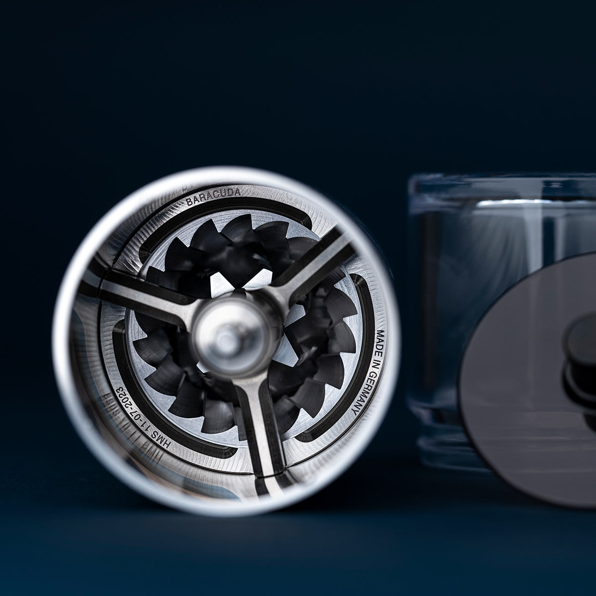 Nach der Härtung und Anlassung geben wir der fertigen BARACUDA® den letzten technischen Feinschliff. Wir schleifen Mikroklingen von den Spitzen der Z-Zähne ab, um einen extrem scharfen Mahleingang zu schaffen. Abschließend wird das Mahlwerk mikropoliert für ein chirurgisch sauberes und glänzendes Finish.